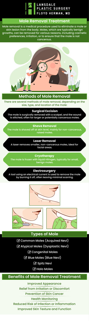 Common questions asked by clients: Is it better to remove moles or leave them? What is the best option to remove a mole? Can a mole be removed by a dermatologist? Can moles be completely removed? Mole removal treatment is offered at Lansdale Plastic Surgery Clinic in Colmar, PA. For more information, feel free to contact us or request an appointment online. We are conveniently located at 2405 North Broad Street, Colmar, PA 18915. We serve patients from Colmar PA, Montgomeryville PA, Lansdale PA, Skippack PA, Harleysville PA, Hatfield PA, Blue Bell PA, and surrounding areas!